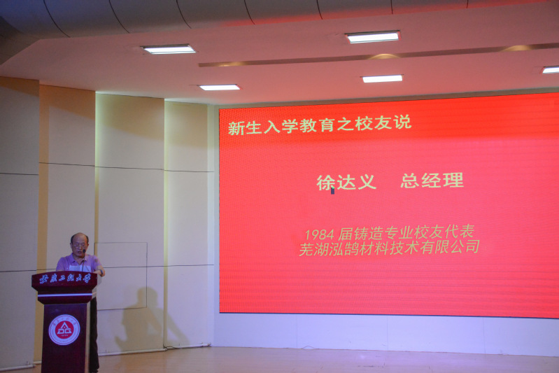 1984届铸造专业校友、芜湖泓鹄材料技术有限公司总经理徐达义饱含深情地发言,他深情回顾42年前入校以来的成长发展历程,寄语2022级新生:既要学会“为学”,更要学会“为人”,懂得“感恩”。“我做学生时的梦想,就是成为一名工程师,如今我已实现了自已的梦想!这一生的经历使我深刻的体会到:个人命运只有与祖国的命运、与时代的发展结合起来,才能更精彩,更有意义!我愿借此机会,寄语在座的每一位同学,希望你们早立志、立大志,珍惜美好青春年华,刻苦学习,努力掌握本领,早日成为建设祖国的栋樑之材”。