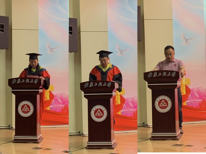 随后毕业生代表材科192班张玉宝发言,与所有毕业生共同回忆了大学四年的美好时光,并向辛苦教导培育的老师们表示衷心感谢;毕业生家长代表材控192班井义晨同学的父亲感谢院校领导和各位老师对同学们的付出,向即将走出校园的同学们表示祝贺,祝福同学们在未来的人生新篇章中实现理想,不负青春,不负韶华;教师代表蒋雪雯送上了对毕业生的深情嘱托和美好祝愿,希望学生们永葆一颗平常心,活得快乐、学会感恩、学会坚强。